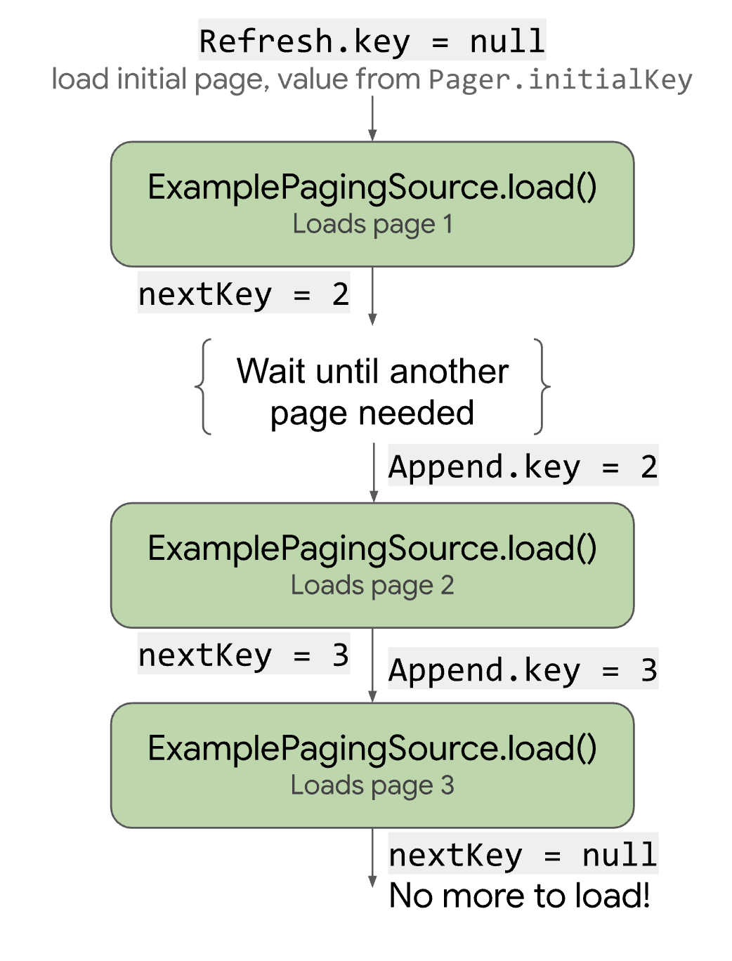 일반적인 PagingSource 구현은 생성자에 제공된 매개 변수를 load () 메서드에 전달하여 쿼리에 적합한 데이터를 로드한다. 위의 예제에서 매개 변수가 의미 하는 내용은 다음과 같다.